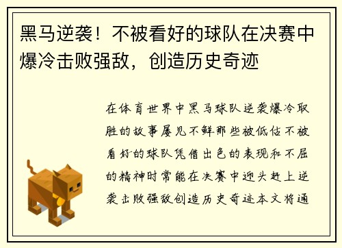 在体育世界中,黑马球队逆袭、爆冷取胜的故事屡见不鲜。那些被低估、不被看好的球队,凭借出色的表现和不屈的精神,时常能在决赛中迎头赶上,逆袭击败强敌,创造历史奇迹。本文将通过四个方面详细阐述这一现象,分析...