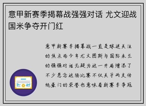 意甲新赛季揭幕战一直是球迷关注的焦点,而今年尤文图斯与国际米兰的强强对话无疑为这一开局增添了不少悬念。这场比赛不仅关乎两支传统豪门的荣誉,也意味着新赛季争冠格局的初步体现。尤文图斯和国际米兰两队都有着...