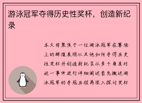 本文将聚焦于一位游泳冠军在赛场上的辉煌表现,以及他如何夺得历史性奖杯并创造新纪录。从多个角度对这一事件进行详细阐述,首先概述游泳冠军的夺冠历程,再深入探讨奖杯的历史意义、新纪录的打破过程、背后的训练与...