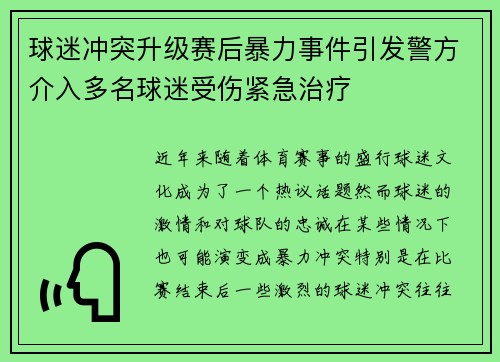 近年来,随着体育赛事的盛行,球迷文化成为了一个热议话题。然而,球迷的激情和对球队的忠诚在某些情况下也可能演变成暴力冲突。特别是在比赛结束后,一些激烈的球迷冲突往往会引发严重的暴力事件,甚至导致警方介入...