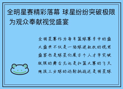 全明星赛作为每年篮球赛季中的盛大盛典,不仅是一场球迷狂欢的视觉盛宴,也是球星们展示个人才华、突破极限的舞台。无论是扣篮大赛的飞天绝技,三分球的远射挑战,还是明星球员在比赛中的精彩表现,都是全明星赛的看...
