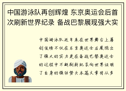 中国游泳队近年来在世界舞台上屡创佳绩,不仅在东京奥运会后展现出了强大的实力,更在备战巴黎奥运会的过程中不断刷新纪录,向世界证明了自身的强劲势头。本篇文章将从多个方面详细阐述中国游泳队在东京奥运会后的突...