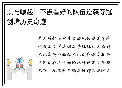 黑马崛起,不被看好的队伍逆袭夺冠创造历史奇迹的故事,往往让人感到无比震撼和激动。无论是在体育赛事中,还是在其他领域,这种逆袭之路都充满了艰难和不确定性,却又体现了坚持、信念和团队的力量。从前期被低估,...