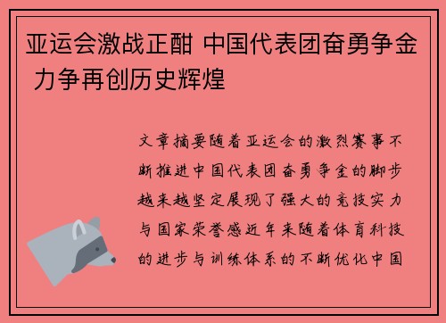 文章摘要:随着亚运会的激烈赛事不断推进,中国代表团奋勇争金的脚步越来越坚定,展现了强大的竞技实力与国家荣誉感。近年来,随着体育科技的进步与训练体系的不断优化,中国运动员在多个项目中迎难而上,不断突破自...
