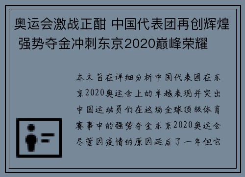 本文旨在详细分析中国代表团在东京2020奥运会上的卓越表现,并突出中国运动员们在这场全球顶级体育赛事中的强势夺金。东京2020奥运会,尽管因疫情的原因延后了一年,但它依然成为了全球运动员们的竞技舞台。...