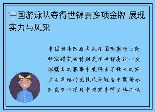 中国游泳队近年来在国际赛场上频频取得突破,特别是在世锦赛这一全球瞩目的赛事中,展现出了强大的实力与卓越的竞技风采。随着中国游泳队在多个项目中频频夺得金牌,不仅彰显了国家在水上运动领域的领先地位,也激励...