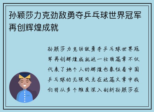 孙颖莎力克劲敌勇夺乒乓球世界冠军,再创辉煌成就。这一壮丽篇章不仅代表了她个人的辉煌,也象征着中国乒乓球的无限风光。在这篇文章中,我们将从多个维度深入剖析孙颖莎在世界冠军赛场上的表现。首先,将从她的技术...
