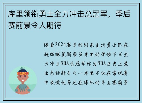 随着2024赛季的到来,金州勇士队在超级球星斯蒂芬·库里的带领下,正全力冲击NBA总冠军。作为NBA历史上最出色的射手之一,库里不仅在常规赛中表现优异,还在球队的季后赛前景中扮演着举足轻重的角色。勇士...