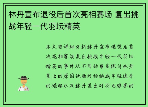 本文将详细分析林丹宣布退役后首次亮相赛场,复出挑战年轻一代羽坛精英的事件。从不同的角度探讨林丹复出的原因、他面对的挑战、年轻选手的崛起、以及林丹复出对羽毛球界的影响等方面,全面解析这位羽坛传奇选手的复...