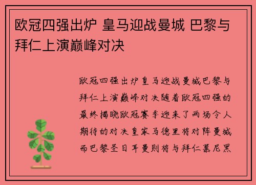 欧冠四强出炉,皇马迎战曼城,巴黎与拜仁上演巅峰对决。随着欧冠四强的最终揭晓,欧冠赛季迎来了两场令人期待的对决。皇家马德里将对阵曼城,而巴黎圣日耳曼则将与拜仁慕尼黑展开激烈的较量。两场比赛的对决不仅展现...