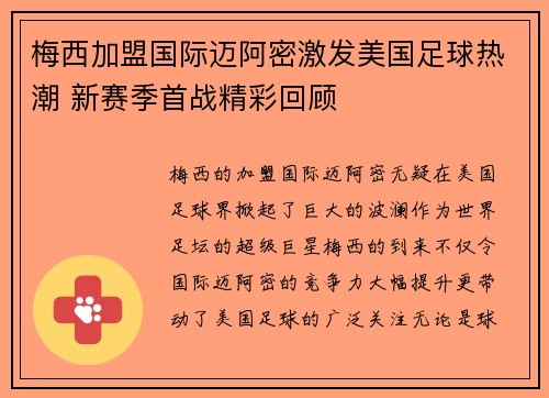梅西的加盟国际迈阿密,无疑在美国足球界掀起了巨大的波澜。作为世界足坛的超级巨星,梅西的到来不仅令国际迈阿密的竞争力大幅提升,更带动了美国足球的广泛关注。无论是球迷、媒体,还是赞助商,都开始将目光聚焦于...