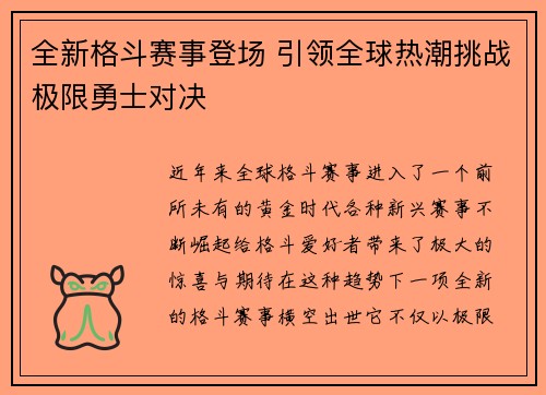 近年来,全球格斗赛事进入了一个前所未有的黄金时代,各种新兴赛事不断崛起,给格斗爱好者带来了极大的惊喜与期待。在这种趋势下,一项全新的格斗赛事横空出世,它不仅以极限勇士对决为核心亮点,更以其创新的比赛形...