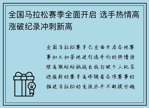 全国马拉松赛季已全面开启,各地赛事如火如荼地进行,选手们的热情持续高涨,纷纷挑战自我,打破个人纪录,迎接新的赛季高峰。随着各项赛事的推进,马拉松的竞技水平不断提升,越来越多的选手不仅在赛道上拼搏,更是...