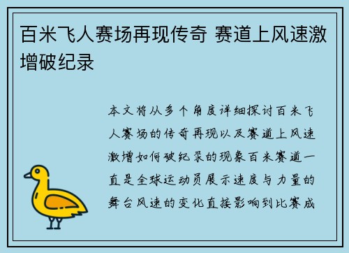 本文将从多个角度详细探讨百米飞人赛场的传奇再现,以及赛道上风速激增如何破纪录的现象。百米赛道一直是全球运动员展示速度与力量的舞台,风速的变化直接影响到比赛成绩。本篇文章首先通过概括赛事本身的特殊性以及...