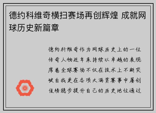 德约科维奇,作为网球历史上的一位传奇人物,近年来持续以卓越的表现席卷全球赛场,不仅在技术上不断突破自我,更在各项大满贯赛事中屡创佳绩,稳步提升自己的历史地位。通过不断的努力与挑战,德约科维奇成为了网球...