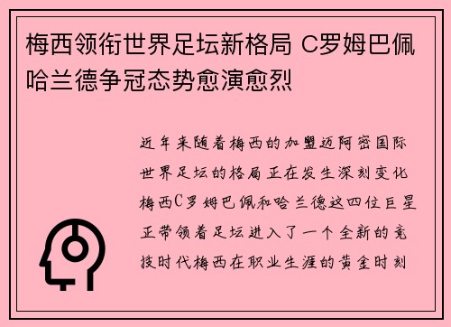 近年来,随着梅西的加盟迈阿密国际,世界足坛的格局正在发生深刻变化。梅西、C罗、姆巴佩和哈兰德这四位巨星,正带领着足坛进入了一个全新的竞技时代。梅西在职业生涯的黄金时刻,选择了前往美国开启新篇章,而C罗...