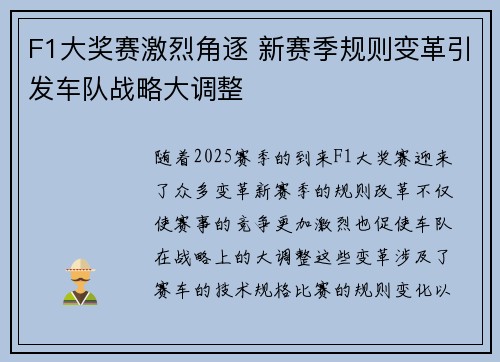 随着2025赛季的到来,F1大奖赛迎来了众多变革。新赛季的规则改革,不仅使赛事的竞争更加激烈,也促使车队在战略上的大调整。这些变革涉及了赛车的技术规格、比赛的规则变化、以及对车手和车队管理方式的重新审...