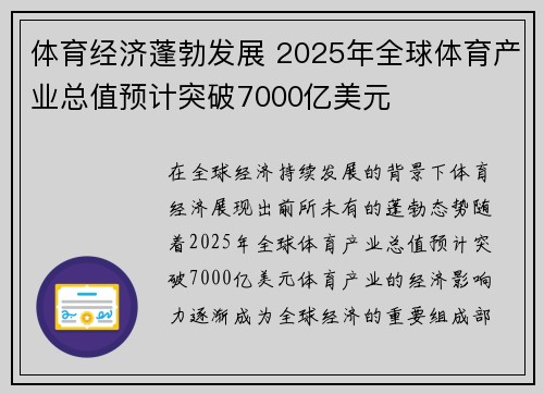 在全球经济持续发展的背景下,体育经济展现出前所未有的蓬勃态势。随着2025年全球体育产业总值预计突破7000亿美元,体育产业的经济影响力逐渐成为全球经济的重要组成部分。从赛事收入到体育赞助,再到数字媒...