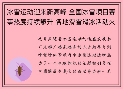 近年来,随着冰雪运动的迅猛发展和广泛推广,越来越多的人开始参与到滑雪、滑冰等项目中,冰雪运动逐渐成为了一个全球热议的话题。特别是在中国,随着冬奥会的成功举办和一系列相关政策的实施,冰雪项目的赛事热度持...