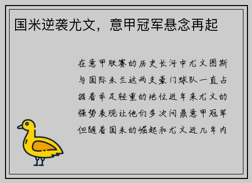 在意甲联赛的历史长河中,尤文图斯与国际米兰这两支豪门球队一直占据着举足轻重的地位。近年来,尤文的强势表现让他们多次问鼎意甲冠军,但随着国米的崛起和尤文近几年内部的波动,意甲冠军的悬念重新回到球迷眼前。...