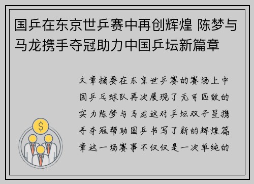 文章摘要:在东京世乒赛的赛场上,中国乒乓球队再次展现了无可匹敌的实力,陈梦与马龙这对乒坛“双子星”携手夺冠,帮助国乒书写了新的辉煌篇章。这一场赛事不仅仅是一次单纯的竞技对抗,更是中国乒乓球深厚底蕴与长...