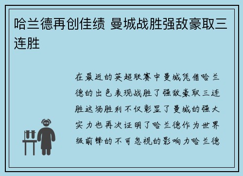 在最近的英超联赛中,曼城凭借哈兰德的出色表现,战胜了强敌,豪取三连胜。这场胜利不仅彰显了曼城的强大实力,也再次证明了哈兰德作为世界级前锋的不可忽视的影响力。哈兰德的进球成为比赛的关键,而曼城的整体表现...