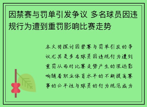本文将探讨因禁赛与罚单引发的争议,尤其是多名球员因违规行为遭到重罚,从而对比赛走势产生的深远影响。随着职业体育水平的不断提高,赛事的公平性与球员的行为规范成为了关注的焦点。因不当行为而遭受禁赛与罚单的...