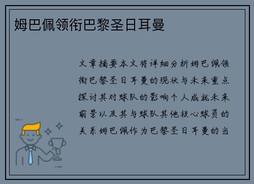 文章摘要:本文将详细分析姆巴佩领衔巴黎圣日耳曼的现状与未来,重点探讨其对球队的影响、个人成就、未来前景以及其与球队其他核心球员的关系。姆巴佩作为巴黎圣日耳曼的当家球星,已经在球队历史上留下了浓墨重彩的...