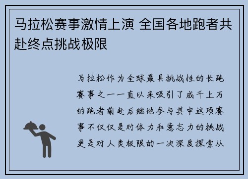 马拉松作为全球最具挑战性的长跑赛事之一,一直以来吸引了成千上万的跑者前赴后继地参与其中。这项赛事不仅仅是对体力和意志力的挑战,更是对人类极限的一次深度探索。从国内到国际,无数跑者通过马拉松赛事展示了人...