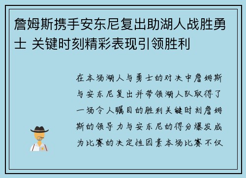 在本场湖人与勇士的对决中,詹姆斯与安东尼复出并带领湖人队取得了一场令人瞩目的胜利。关键时刻,詹姆斯的领导力与安东尼的得分爆发成为比赛的决定性因素。本场比赛,不仅见证了两位球星的精彩表现,也体现了他们在...