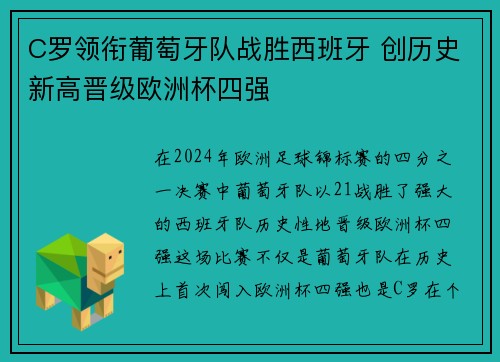 在2024年欧洲足球锦标赛的四分之一决赛中,葡萄牙队以2-1战胜了强大的西班牙队,历史性地晋级欧洲杯四强。这场比赛不仅是葡萄牙队在历史上首次闯入欧洲杯四强,也是C罗在个人职业生涯中再次书写传奇的一刻。...