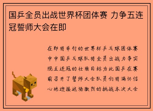 在即将举行的世界杯乒乓球团体赛中,中国乒乓球队将全员出战,力争实现五连冠的壮丽目标。为此,国乒在赛前召开了誓师大会,队员们将满怀信心地迎接这场激烈的挑战。本次大会不仅是对过去成绩的总结,也是对未来战斗...