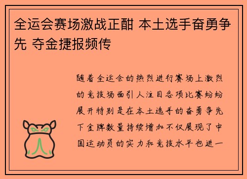随着全运会的热烈进行,赛场上激烈的竞技场面引人注目,各项比赛纷纷展开。特别是在本土选手的奋勇争先下,金牌数量持续增加,不仅展现了中国运动员的实力和竞技水平,也进一步点燃了全体观众的热情。本文将详细阐述...