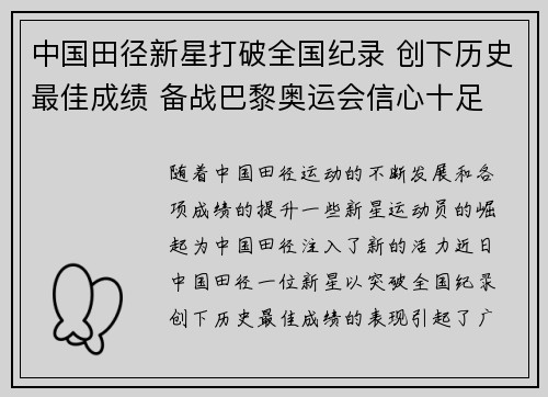 随着中国田径运动的不断发展和各项成绩的提升,一些新星运动员的崛起为中国田径注入了新的活力。近日,中国田径一位新星以突破全国纪录、创下历史最佳成绩的表现引起了广泛关注。这不仅是个人的突破,也象征着中国田...