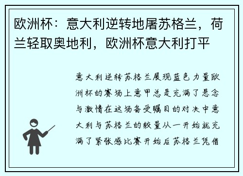 意大利逆转苏格兰,展现蓝色力量 欧洲杯的赛场上,意甲总是充满了悬念与激情。在这场备受瞩目的对决中,意大利与苏格兰的较量从一开始就充满了紧张感。比赛开始后,苏格兰凭借主场优势迅速进入状态,通过一次精妙的...