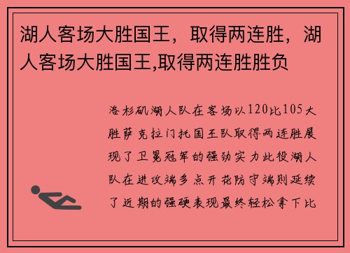 洛杉矶湖人队在客场以120比105大胜萨克拉门托国王队,取得两连胜,展现了卫冕冠军的强劲实力。此役,湖人队在进攻端多点开花,防守端则延续了近期的强硬表现,最终轻松拿下比赛。 比赛一开始,湖人队就展现出...