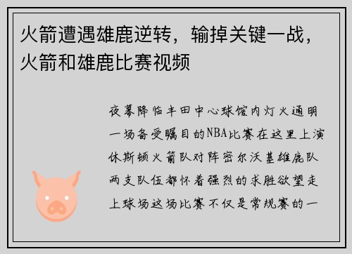 夜幕降临,丰田中心球馆内灯火通明,一场备受瞩目的NBA比赛在这里上演。休斯顿火箭队对阵密尔沃基雄鹿队,两支队伍都怀着强烈的求胜欲望走上球场。这场比赛不仅是常规赛的一部分,更被视为季后赛席位争夺的关键战...