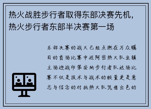 东部决赛的战火已经点燃!在万众瞩目的首场比赛中,迈阿密热火队坐镇主场,迎战印第安纳步行者队。这场比赛不仅是技术与战术的较量,更是意志与信念的对抗。热火队凭借出色的团队配合、关键时刻的冷静表现以及wal...