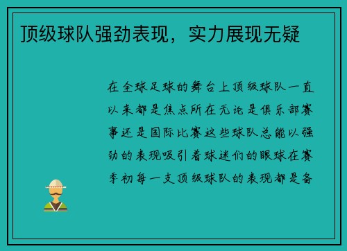 在全球足球的舞台上,顶级球队一直以来都是焦点所在。无论是俱乐部赛事还是国际比赛,这些球队总能以强劲的表现吸引着球迷们的眼球。在赛季初,每一支顶级球队的表现都是备受关注的,而在他们经过一系列的激烈竞争后...