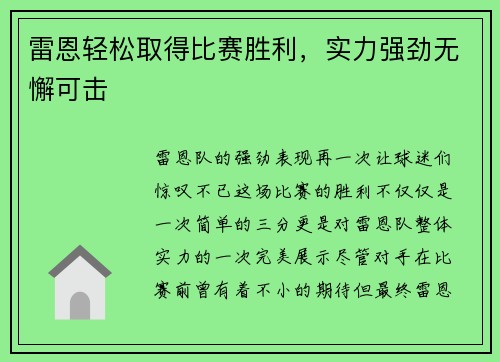 雷恩队的强劲表现,再一次让球迷们惊叹不已。这场比赛的胜利不仅仅是一次简单的三分,更是对雷恩队整体实力的一次完美展示。尽管对手在比赛前曾有着不小的期待,但最终雷恩队却以极为轻松的方式拿下比赛,毫无悬念地...