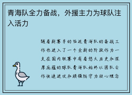 随着新赛季的临近,青海队的备战工作也进入了一个全新的阶段。作为一支在国内联赛中有着悠久历史和深厚底蕴的球队,青海队始终以团队合作、快速进攻和顽强防守为核心理念,而如今,在外援主力的强力加盟下,球队无疑...