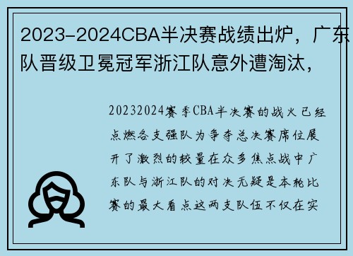 2023-2024赛季CBA半决赛的战火已经点燃,各支强队为争夺总决赛席位展开了激烈的较量。在众多焦点战中,广东队与浙江队的对决无疑是本轮比赛的最大看点。这两支队伍不仅在实力上旗鼓相当,更承载着无数球...