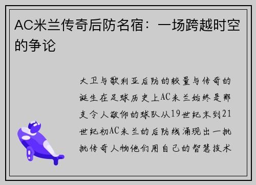 大卫与歌利亚:后防的较量与传奇的诞生 在足球历史上,AC米兰始终是那支令人敬仰的球队。从19世纪末到21世纪初,AC米兰的后防线涌现出一批批传奇人物,他们用自己的智慧、技术和汗水铸就了球队的辉煌。当我...