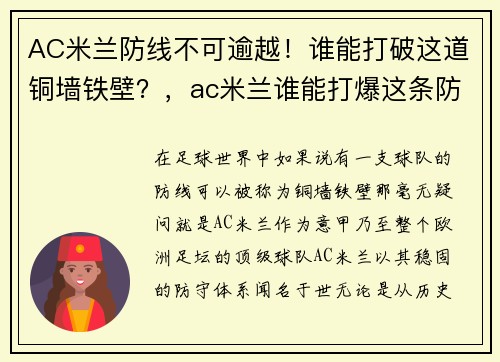 在足球世界中,如果说有一支球队的防线可以被称为“铜墙铁壁”,那毫无疑问就是AC米兰。作为意甲乃至整个欧洲足坛的顶级球队,AC米兰以其稳固的防守体系闻名于世。无论是从历史战绩还是近期表现来看,AC米兰的...