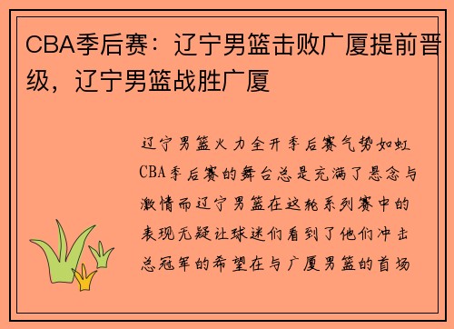 辽宁男篮火力全开,季后赛气势如虹 CBA季后赛的舞台总是充满了悬念与激情,而辽宁男篮在这轮系列赛中的表现无疑让球迷们看到了他们冲击总冠军的希望。在与广厦男篮的首场对决中,辽宁男篮展现了十足的斗志和默契...