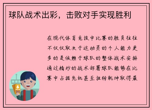 在现代体育竞技中,比赛的胜负往往不仅仅取决于运动员的个人能力,更多的是依赖于球队的整体战术安排。通过精妙的战术部署,球队能够在比赛中占据先机,甚至扭转乾坤,取得最终的胜利。近日,一场引人注目的比赛就展...