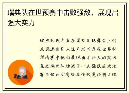 瑞典队近年来在国际足球舞台上的表现逐渐引人注目,尤其是在世界杯预选赛中,他们展现出了非凡的实力。最近,瑞典队迎战了一支强敌,这场比赛不仅让所有观众惊叹,更证明了瑞典足球的崛起。比赛中,瑞典队通过坚韧不...