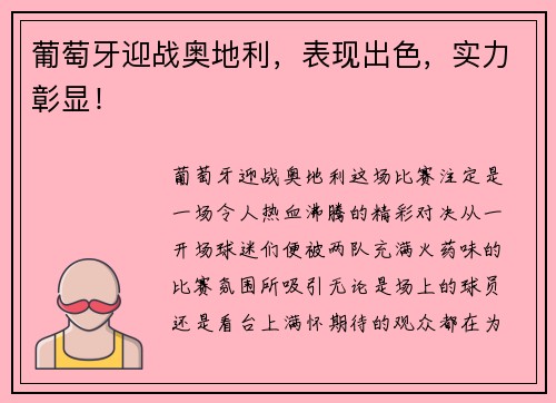 葡萄牙迎战奥地利,这场比赛注定是一场令人热血沸腾的精彩对决。从一开场,球迷们便被两队充满火药味的比赛氛围所吸引。无论是场上的球员,还是看台上满怀期待的观众,都在为这场激烈的对抗做好了准备。而最终,葡萄...