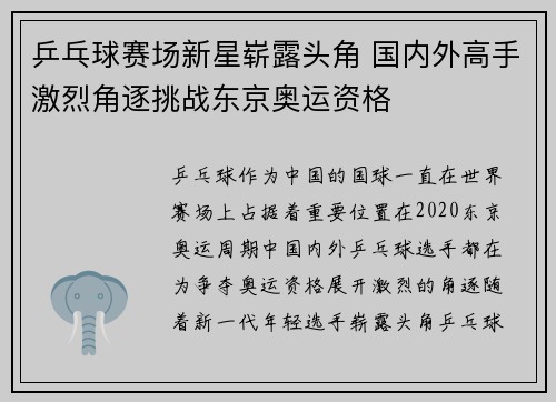 乒乓球作为中国的国球,一直在世界赛场上占据着重要位置。在2020东京奥运周期中,国内外乒乓球选手都在为争夺奥运资格展开激烈的角逐。随着新一代年轻选手崭露头角,乒乓球赛场的竞争愈加激烈,呈现出前所未有的...
