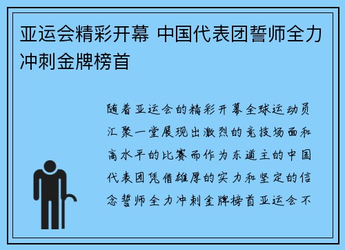随着亚运会的精彩开幕,全球运动员汇聚一堂,展现出激烈的竞技场面和高水平的比赛,而作为东道主的中国代表团,凭借雄厚的实力和坚定的信念,誓师全力冲刺金牌榜首。亚运会不仅是各国运动员竞技的舞台,也是文化交流...